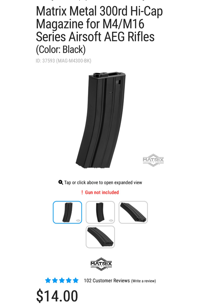Magazine: 300rds. Compatible with JG, Matrix, Tokyo Marui, G&G, MAG, and other similar M4/M16 Airsoft AEG Mags