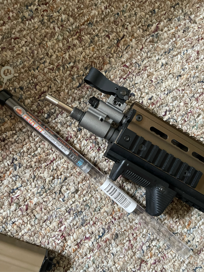 The gun can easily hop my .42 bbs so make sure to use heavy bbs for the DMR configuration. Gun is in perfect working condition, shoots like a charm.