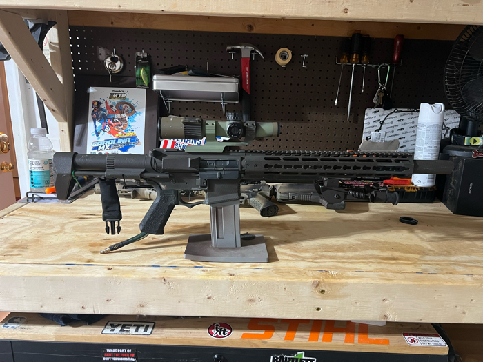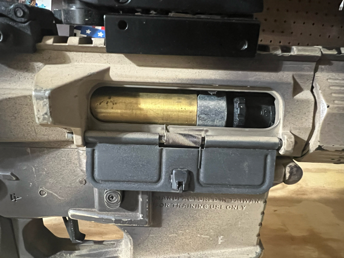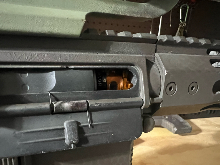 Polarstar F2 engine, mounted in an Ares frame with fully upgraded internals from a maxx HopUp unit to a madbull tightbore barrel. Brand new air lines and 3 air tanks, and some mags to boot. Custom angel suppressor makes it deadly quiet (I use it with a ghillie suit)