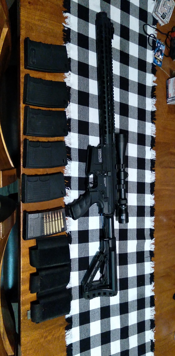 G&G tr16 308 with scope 3 to 9 magnification. 5 mid cap mags and one high cap mag. Comes with velcro mag pouch. Only used twice. Open to trades for hpa.