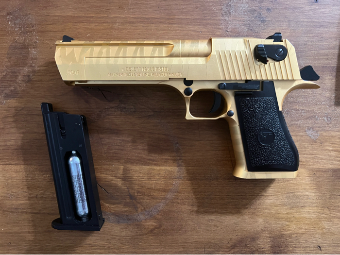 That’s right the golden tigerstrip deagle It’s as crazy as it is awesome!! Full blow back and take co2 1 mag included Barely fired