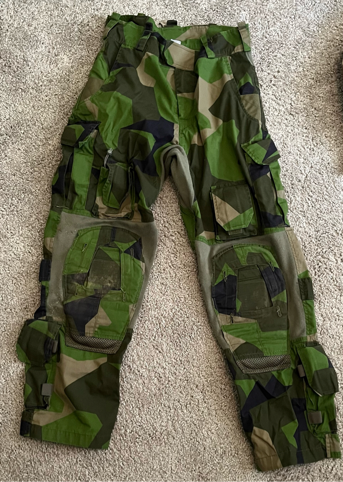 Lightly used Swedish M90 Crye cut trousers with knee pads. Size 32 waist