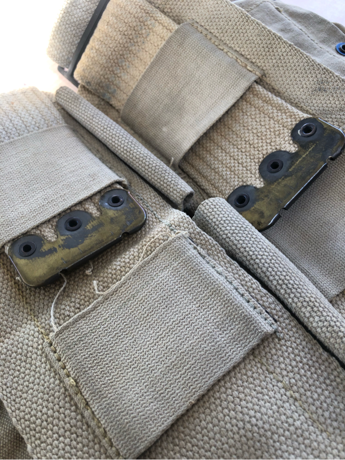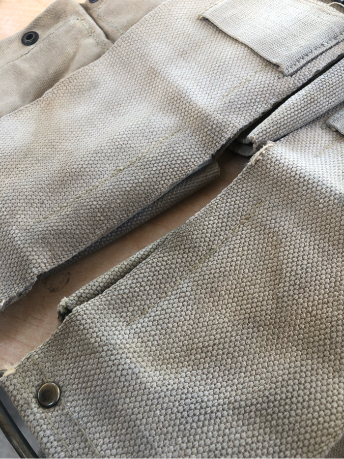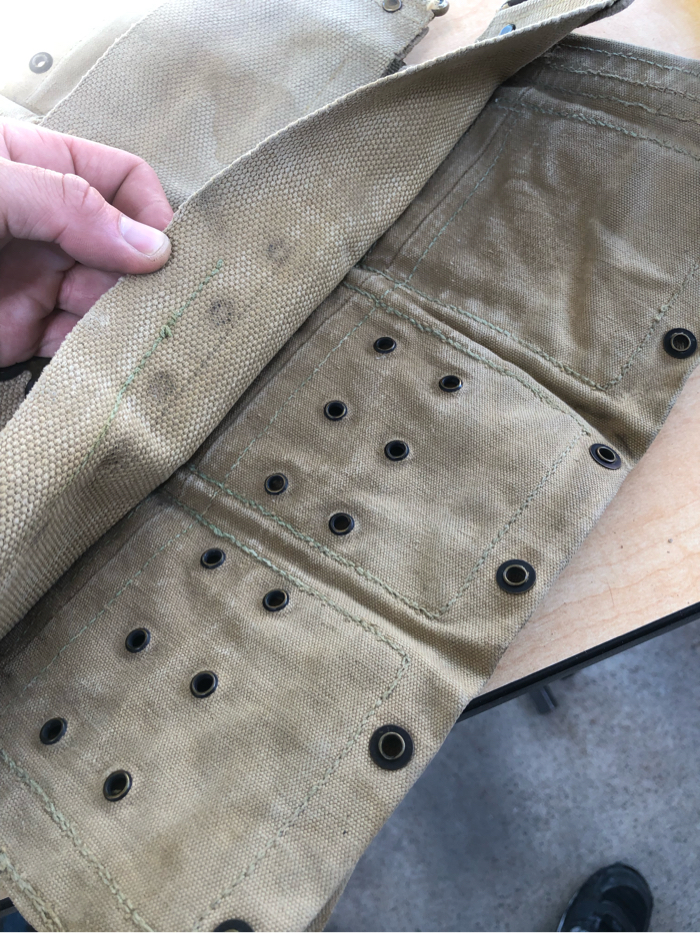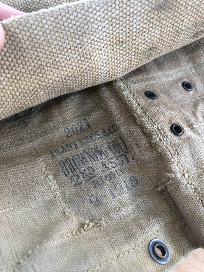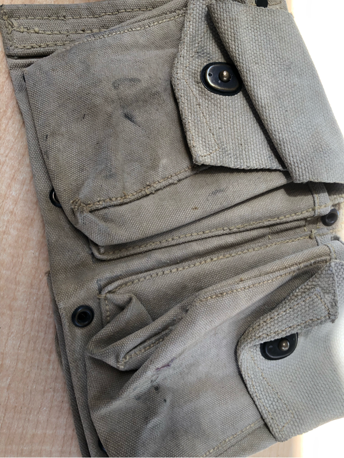 I never put this BAR Magazine Pouch Belt to work. It’s in great condition. Has some liquid staining (maybe from water), but all grommets are clean and in good condition. All buttons have a clean snap to them. Stamped/Dated 1918 (see images).