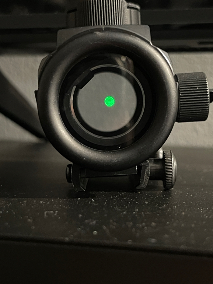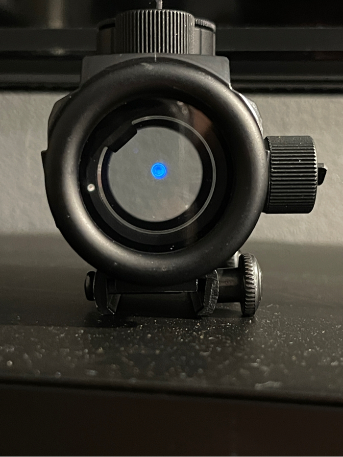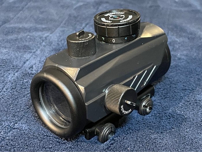 Simple red dot for picatinny rails can cycle between 3 colors, comes with protective silicone cover.