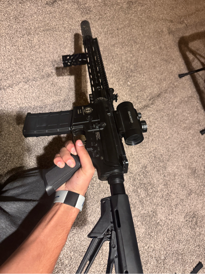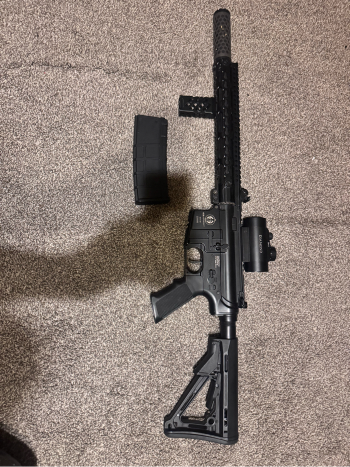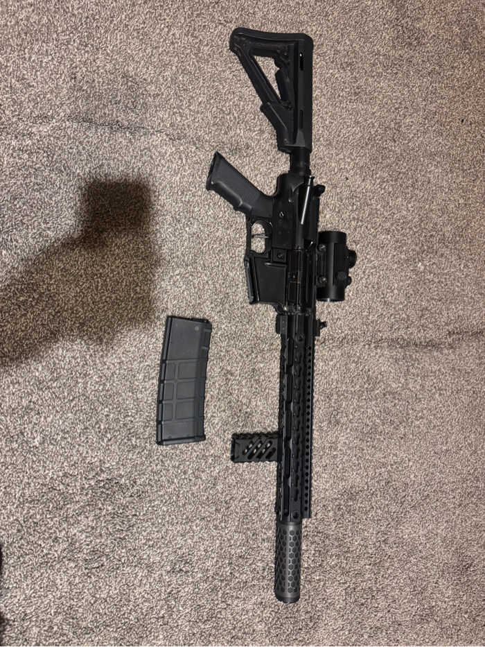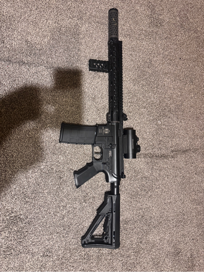 Great gun for beginners has custom speed trigger as well as a suppressor and a keylock 15 inch barrel mod with vertical grip and red dot.