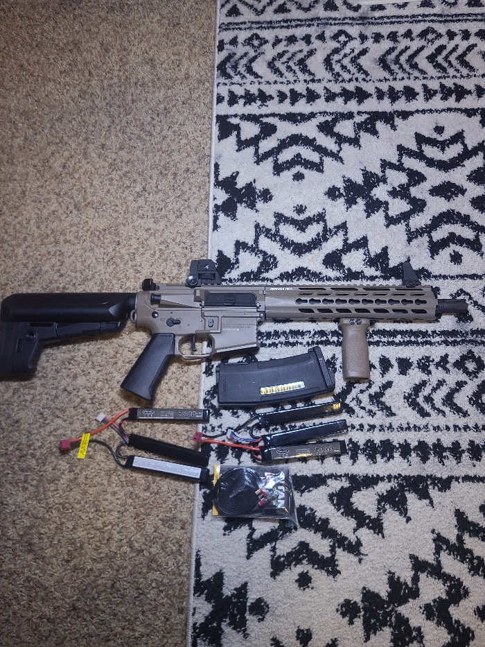 Umbrella armory krytac pdw. Used about 3 outings. TITAN GATE drop-in module with all plugs/cables/adapters. Factory open sights. 2 2000mah lipo batteries included. Collapsible stock. Tan color. LOCAL PICKUP ONLY