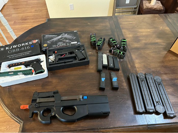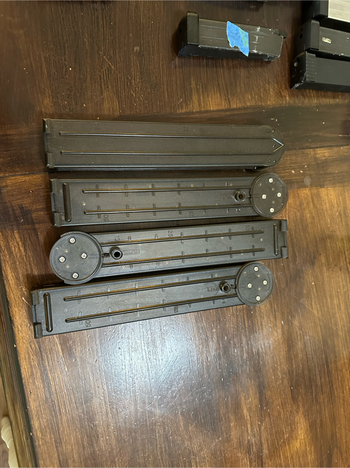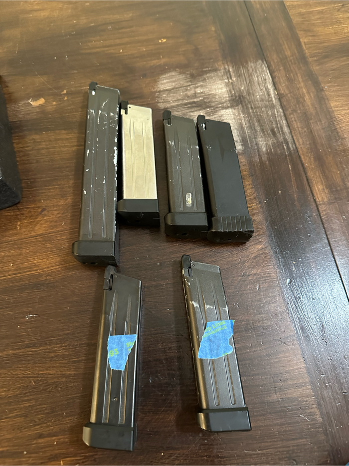 3 hi capa mags, 1 extended mag, 2 leaking mags. Custom mag holders look kinda janky but actually work pretty well.