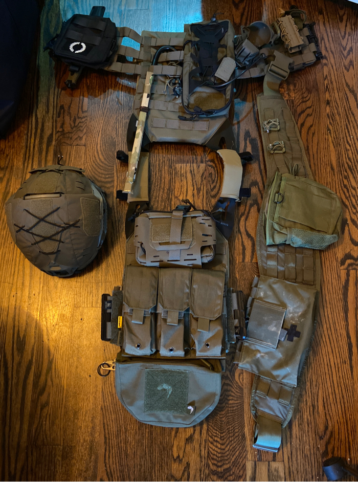 I am selling my green set up of a GPC 1.0 Emerson gold label plate carrier with foam inserts. Also selling my harness belt with small mag, dump and green affect case along with some small green straps also made by Emerson and last, but not least a green, A-frame pump helmet, the thicker kind with a green helmet cover. Helmet comes with upgraded padding and upgraded rear cinch. The plate carrier comes with all the pouches that you see that are on it except for the antenna for the radio that does not come with it. Or the combat knife that does not come with it either. Lots of add-ons on the JPC like quick detach latches, padded, shoulder pads, upgrade admin pouch with upgraded double stack mag pouches in the front and a drop crotch pouch also black general-purpose pouch on the right side left side M 67 grenade holder and single, handgun mag holder. This is a very comfortable kit and materials. Easy to wash out 1000 D polyester Gore-Tex.