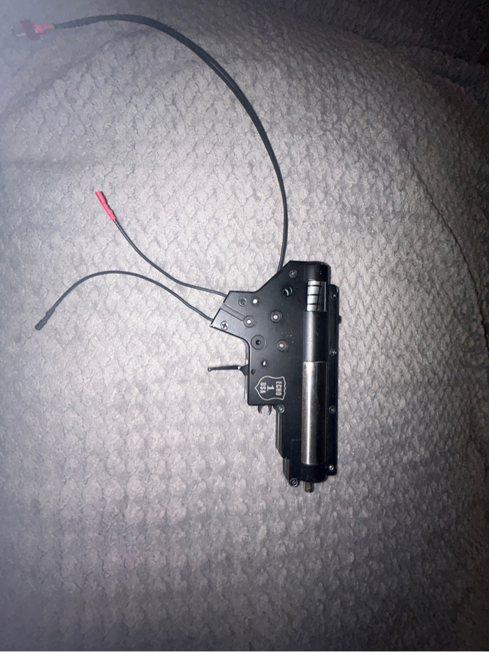 Unknown internals other than listed - Gate Titan - EMG Sailent flat plane trigger - upgraded nozzle,Cylinder, and piston ( unknown brands ) - DSG ( unknown brand ) This gearbox is sold as is. I’m open to offers worst I can say is no !