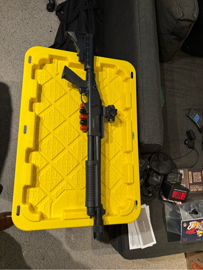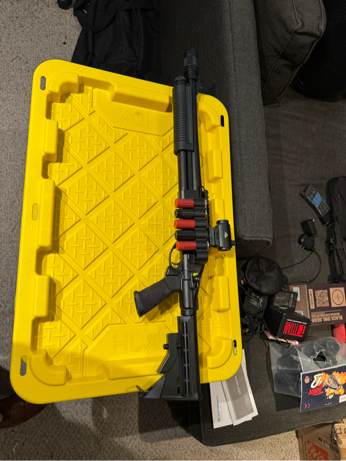 Gas shotgun with everything seen in photos, minus the Holo. Got it for indoor and realized I’m an outdoor guy.