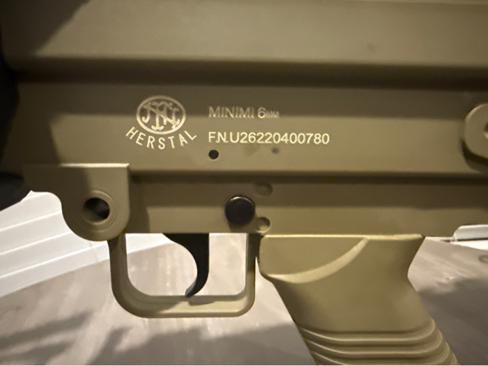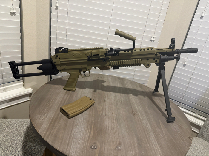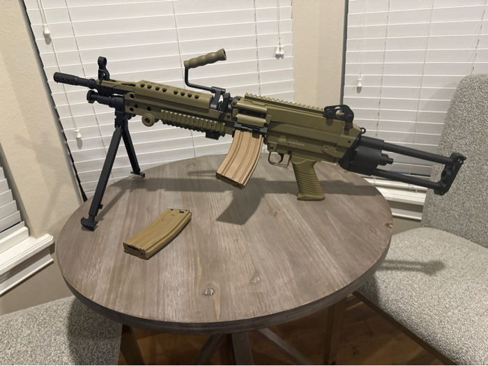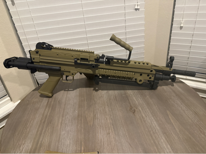 Selling a Cybergun FN Herstal licensed M249 SAW airsoft light machine gun. This is the tan MK46/M249 featherweight style with a rail system, folding stock, and deployed bipod. The rifle is solid, realistic, and great for support roles in airsoft games.