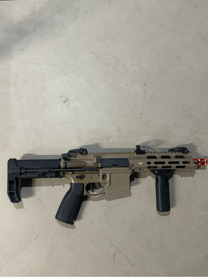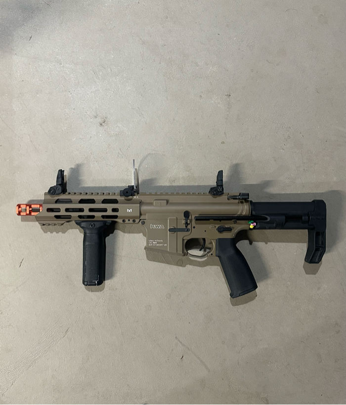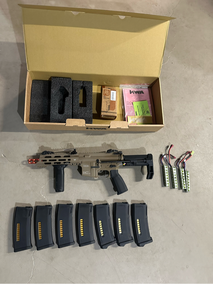 I’m selling a kwa vm4 ronin t6 with 7 kwa mags and 4 elite force batteries. It also comes included with a hand grip and a sight protector, and the battery charger it also comes included the original box.