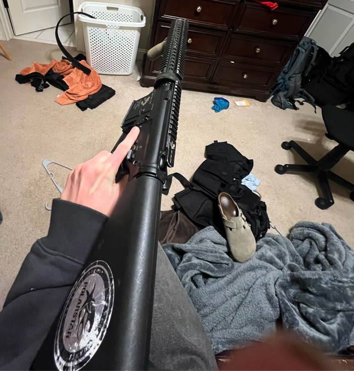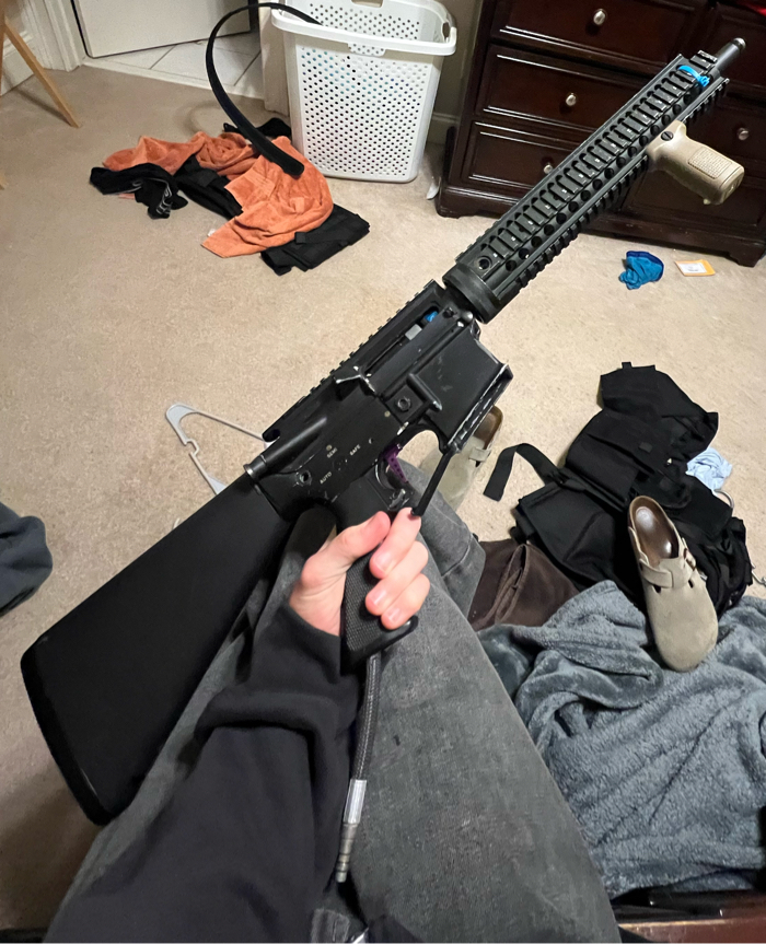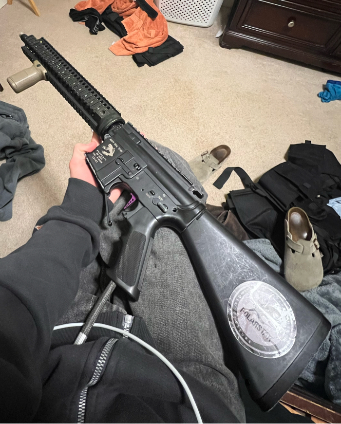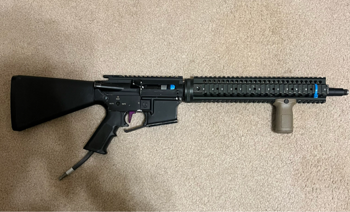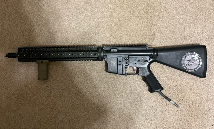 Polarstar jack with a gorilla fcu, speed trigger tuned to a hair trigger, prowin HopUp with a flat nub and madbull 60 degree bucking, 6.02 inner barrel cut to fit the outer barrel.