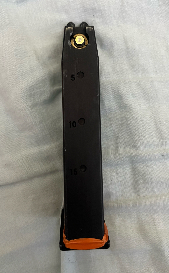 Note: Magazine plate is damaged and loose. Tape present to hold base intact. Fully functional. Minimal wear on M9.