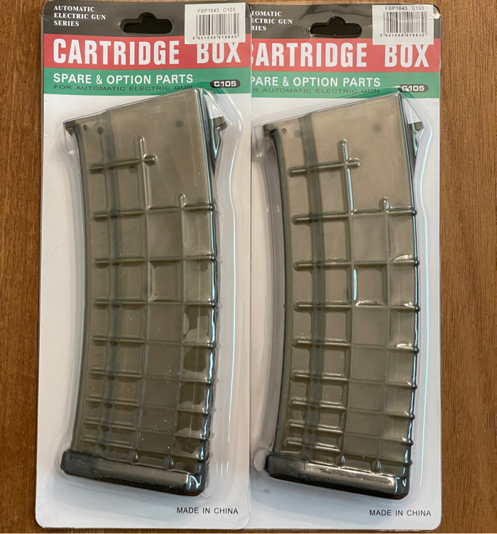 This is a 2 pack of transparent AK74 Mid Cap Mags, each hold 150 rounds, brand is CYMA. Multiple Packs Available!
