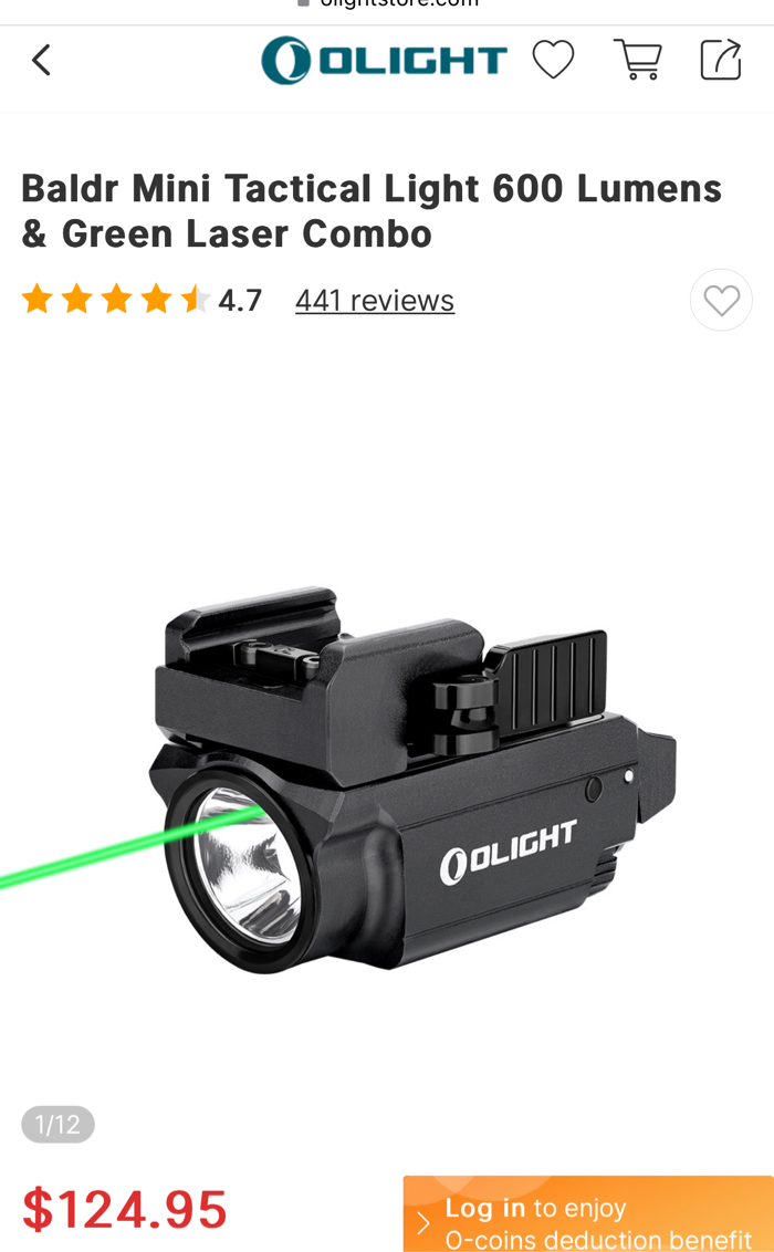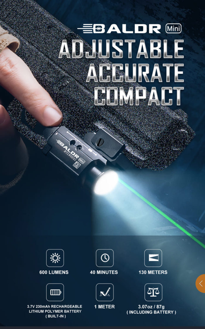 BRAND NEW. NEVER INSTALLED. Olight brand Baldr Mini Tactical Flashlight and Green Laser combo. 600 lumens. Magnetic charger included. Sells on olight store new for $124 plus tax and shipping.