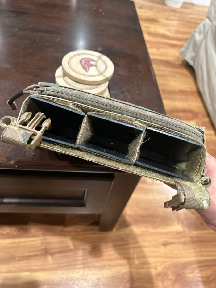 Will include buckles Has triple esstac kywi inserts and a zip pouch for the front panel