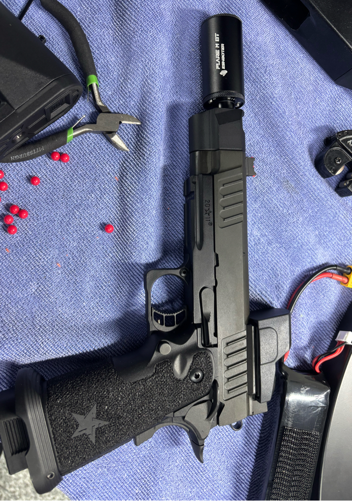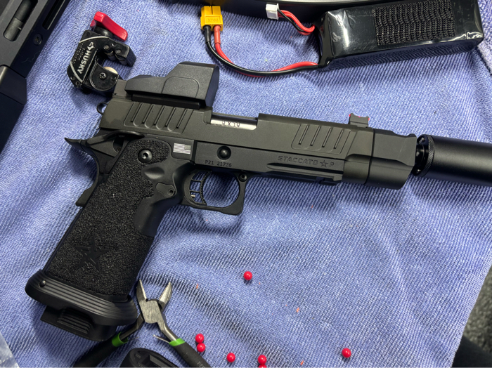 EMG (Army Armament) 6mm Pro Shop Staccato P w/ Comp SOC GBB Airsoft w/ Stippling Grip 4UAD bucking No optic No tracer