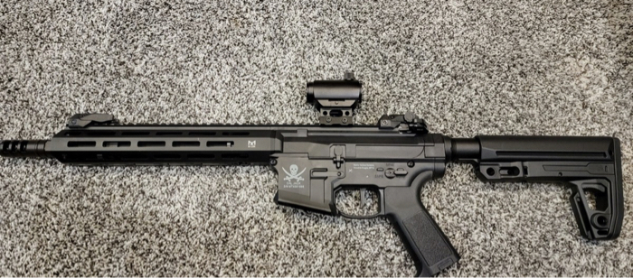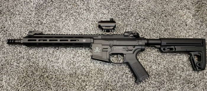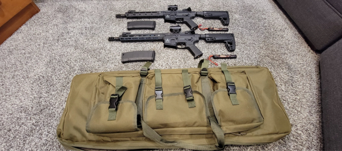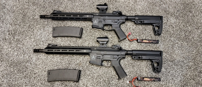 Set of 2 Matrix calico Jack M4, Both are functional, but one of them has an issue with the mosfet sometimes disabling the trigger temporarily on semi and inconsistent bursts on auto, but mechanically it fires and loads well. The other one works perfectly fine. Includes 2 batteries, 2 red dot scopes, 2 mags, 2 metal flash hiders and a case. Both guns have stock gearboxes in good condition and shoot around 400 fps.