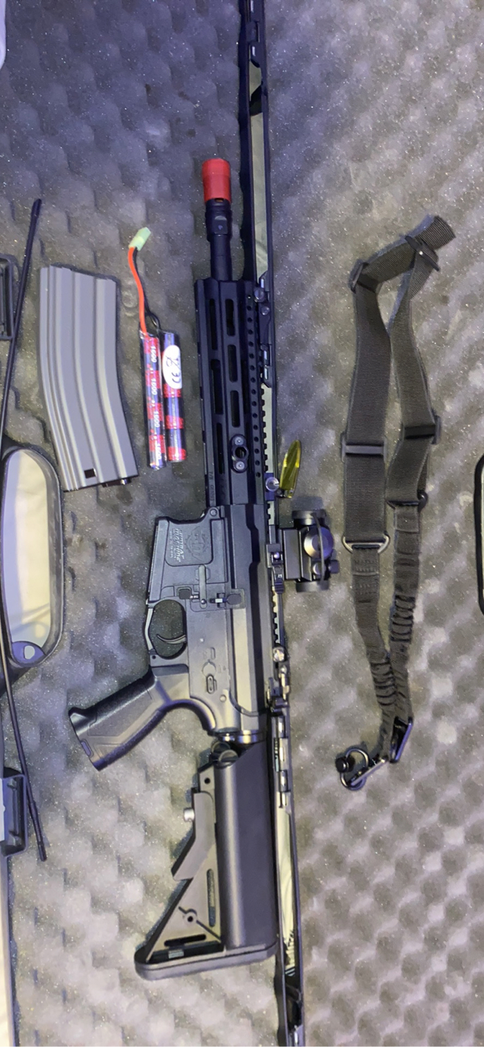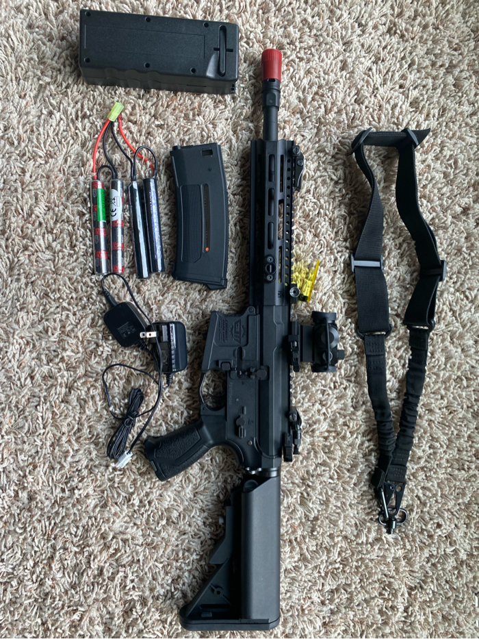 Used in one game practically new. Comes with original 300 round highcap, pts epm 1 midcap, sling, red and green dot sight, deans and tamiya 9.6v battery, charger, speed loader, and sight protector. Have original box for gun and sight. Willing to discuss price.