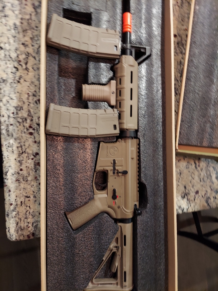 Magpul Moe carbine with 2 mags, fitted lower rail and foregrip, no flip-up sight or batteries included.