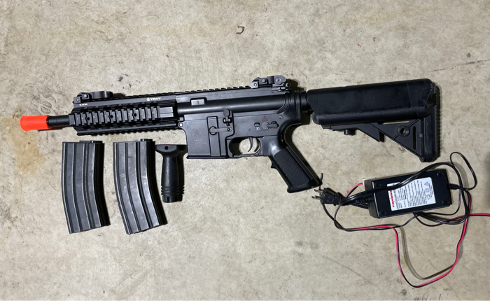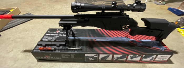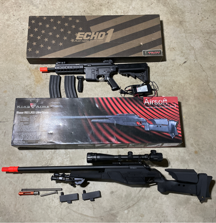 Selling a King Arms Blaser R93 LRS1 Ultra Grade with upgraded internals, illuminated scope, adjustable bipod, and 2 magazines. Along with an Echo1 Troy M4 with a foregrip, 1 mid cap mag, 1 high cap mag, and a battery charger. $260 for both OBO