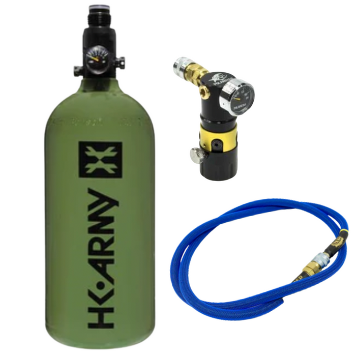 PACKAGE INCLUDES: - HK Army Aluminum Tank - HPA Line - Ultra Compact Regulator - Fill Level Gauge    TANK: The aluminum tanks come with the standard High Pressure compressed air regulator set to the standard output pressure of 800psi. - Aluminum Tank - 48ci / 3000psi - Output Pressure 800psi - Fill Level Gauge  REGULATOR: This ultra compact regulator stands just 3 inches tall and threads directly onto the HPA tank. In so doing it eliminates the need for a separate UFA and keeps your air rig profile to a minimum. What sets this regulator apart from competing models is its integral on/off valve. This enables you to depressurize the system prior to unscrewing it from the tank to elevate wear and possible damage on the tank threads and o-ring. HPA LINE: The SS Airsoft Line was developed during the rise in popularity of High Pressure Air (HPA) Airsoft systems in the United States.  Unlike some other lines in the market, our SS  Lines use a durable wide bore line protected with high-strength nylon sheathing to prevent general wear during games. The biggest benefit of the wide bore line we use is that it allows for more air passage than traditional 6mm macro line. This helps improve refresh rate and helps drive air-hungry systems like Daytona Guns or GBB guns that have been HPA tapped.