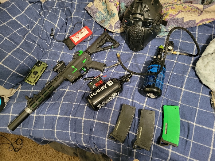 Im selling a SS AIRSOFT HPA CUSTOM ARCHON EMERALD AIRSOFT GUN WITH 2 HPA TANKS , 3 MAGS, TRACER UNIT AND SCOPE , WITH HELMET a little damage to the tanks missing butt stock for hpa gun but easy fix