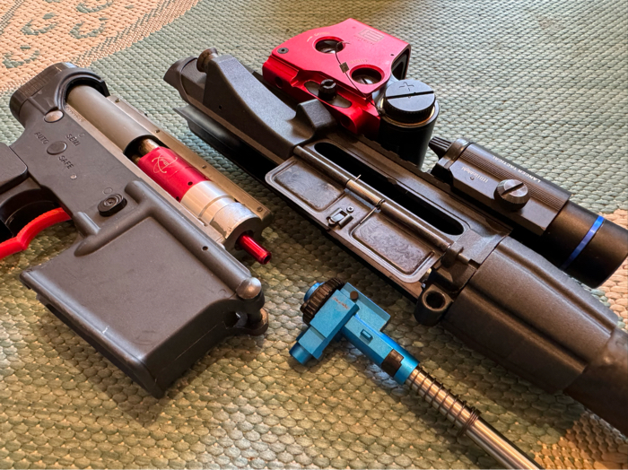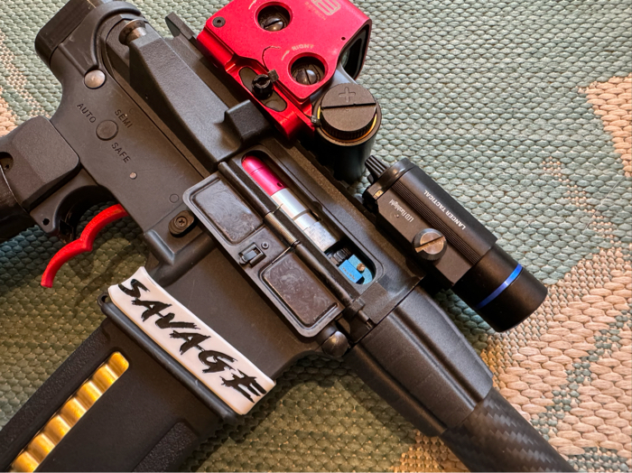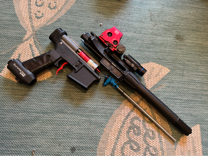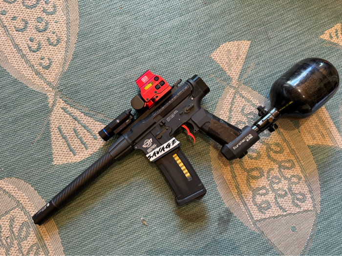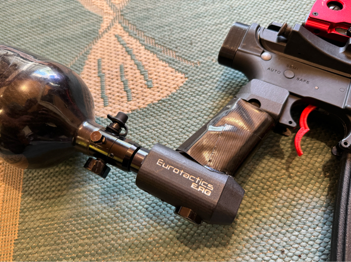It’s a full high strength polymer rifle making it very lightweight. It has a 75° EuroTactics grip with ductape wrapped around it for better grip. The regulator gage is from an airtank so it shows 1-5k psi. The inner barrel also sticks out past the carbon barrel. Shoots 350fps at 100psi with a .25g bb and up to 75rps. FPS range is 290-430. Comes a shown but without attachments, airtank or magazine. Tracer unit, battery charge, battery, fcu, airtank, can be added for extra.