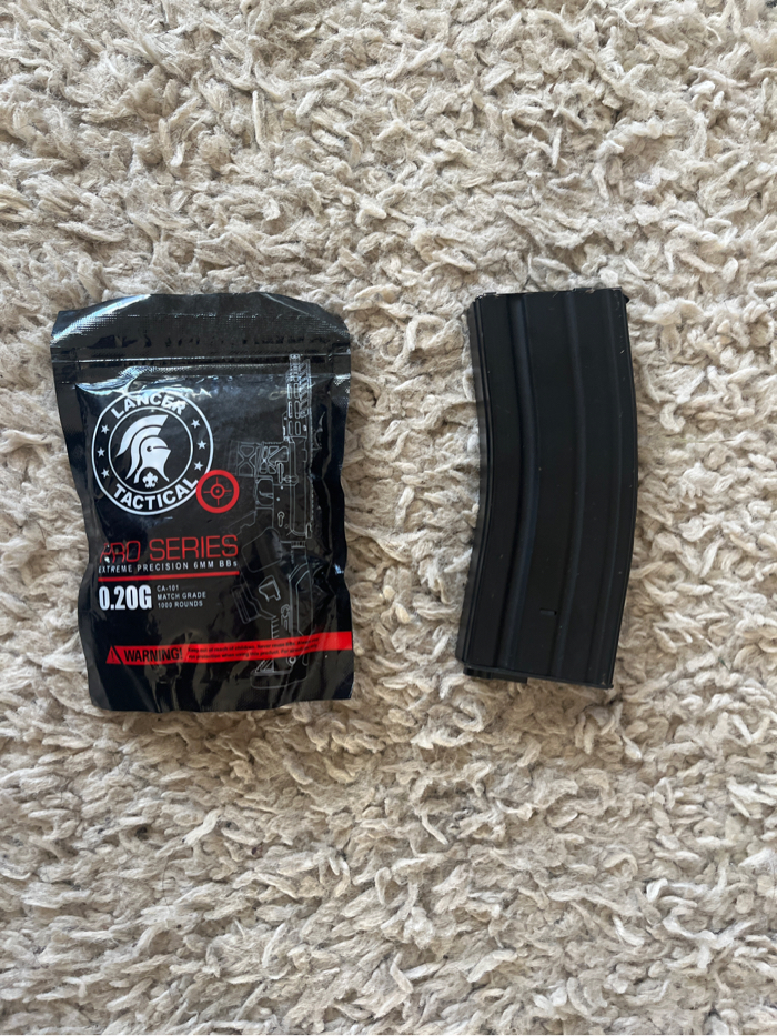 Lancer tactical gen 2 (used) it does work comes with 2 batteries and bbs (a little dusty because it has been used) great starter gun and highly recommend for beginners or intermediate players