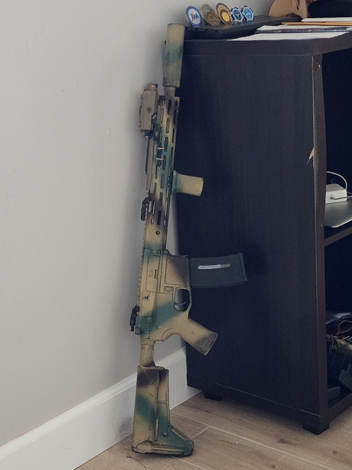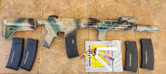 CYMA platinum with functional FMA PEQ, 5 mid cap mags, 11.1 lipo, matrix smart charger, and tracer unit