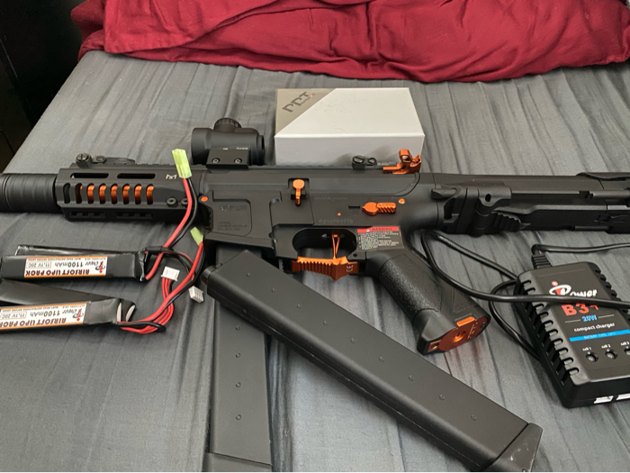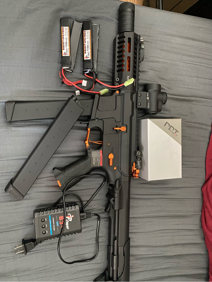 it comes with X2 Battery, X2 300 rounds Mag, Red Dot Scope,upgraded to 35k motor,inner barrel.. Slightly Used, only used once in the field..
