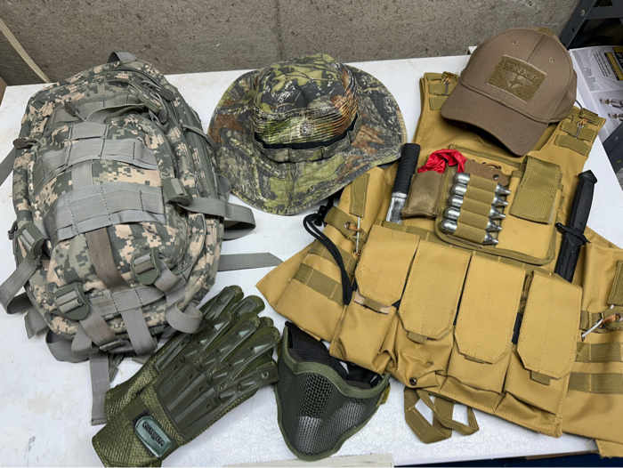 Comes with a tactical vest with lots of pouches (front and back), CO2 sleeve, mock knives. Boonie Hat, Condor Ball Cap (Size L/XL), a Small tactical camo backpack with camo elbow & knee pads (in backpack not pictured), tactical gloves and facemask.