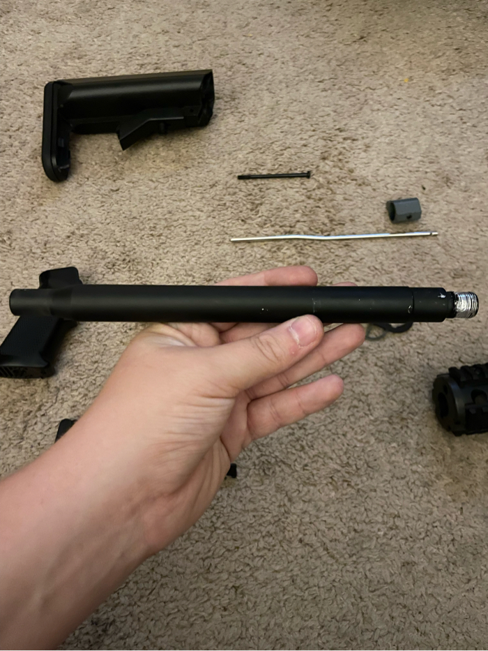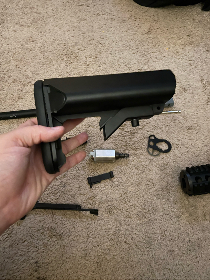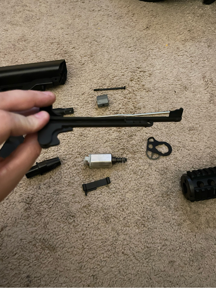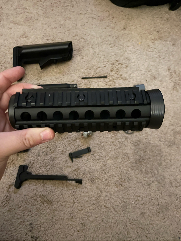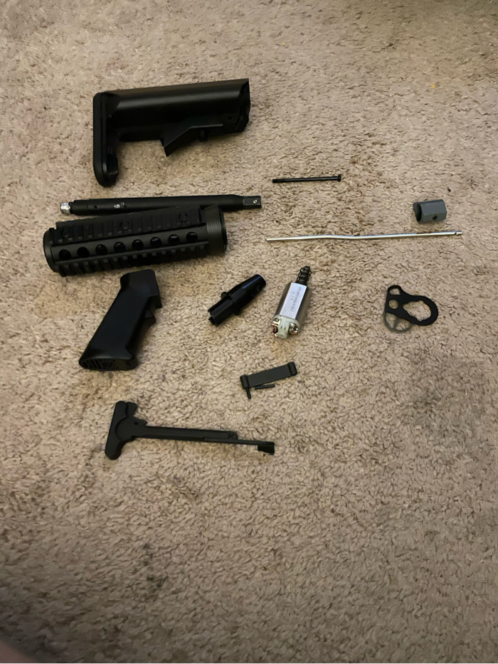 Handgaurd with picitiny rail(sold), trigger guard, outer barrel (sold) with connector, faux gas block and gas rod, sling mount for rear attachment(sold), Buffer tube screw, custom L stock(sold), and charging handle (sold), stock motor, and pistol grip with motor space(sold). Message for offers price isn’t firm. Just want to get rid of them. I’ll pay fees and we can work out the shipping.