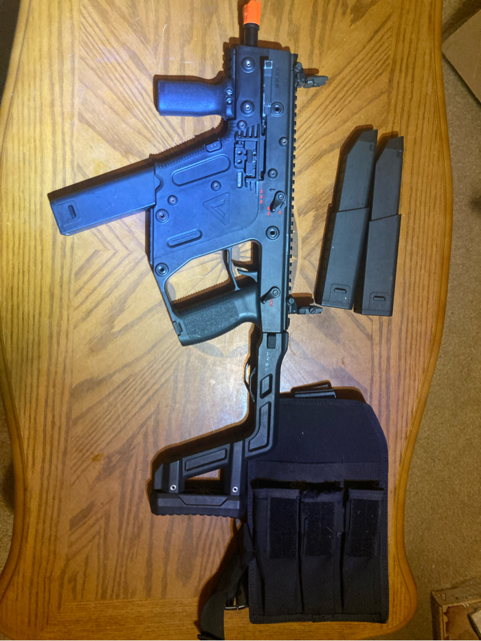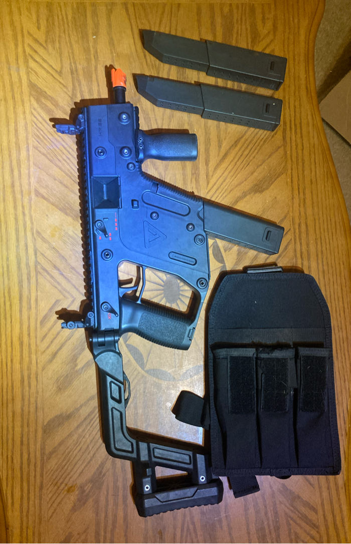 KRISS USA Licensed KRISS Vector Airsoft AEG SMG Rifle by Krytac with battery, red dot sight (not pictured) mag pouch, grip, iron sights, and 2 extra mags