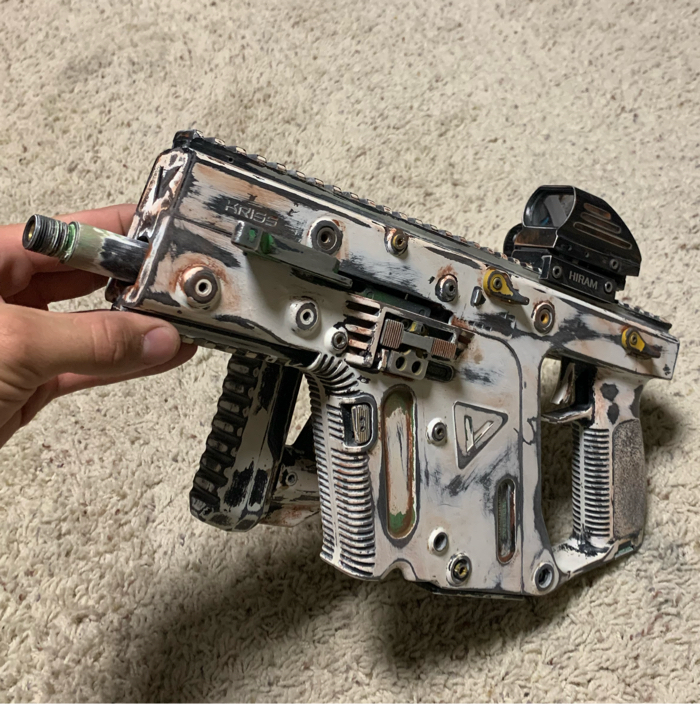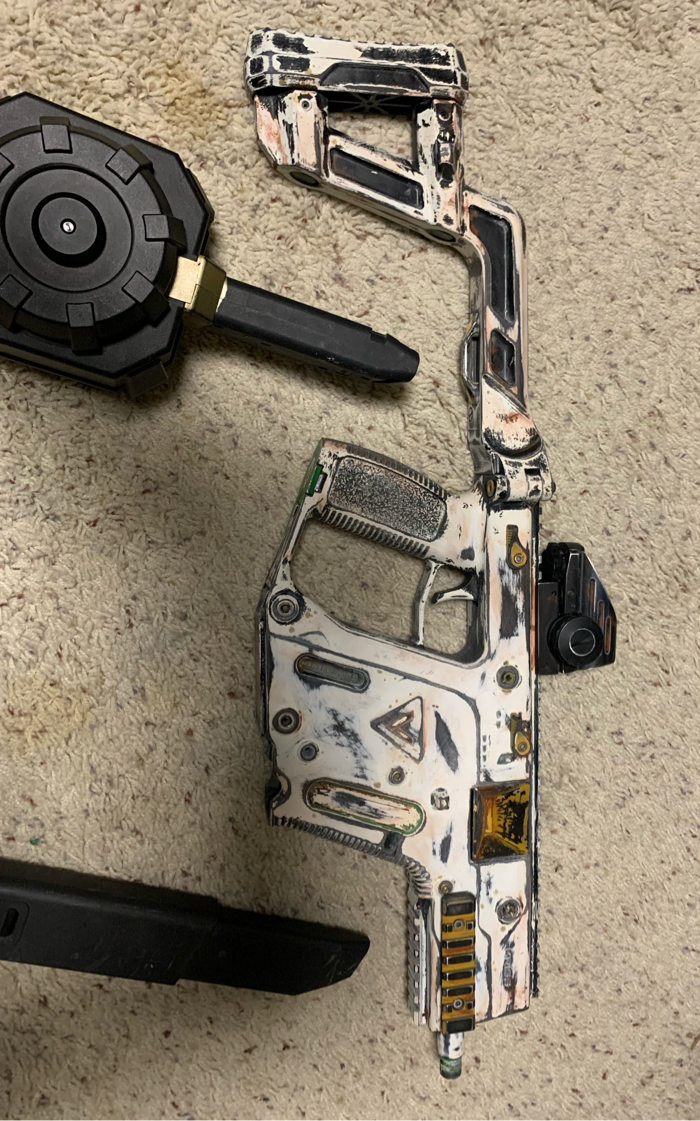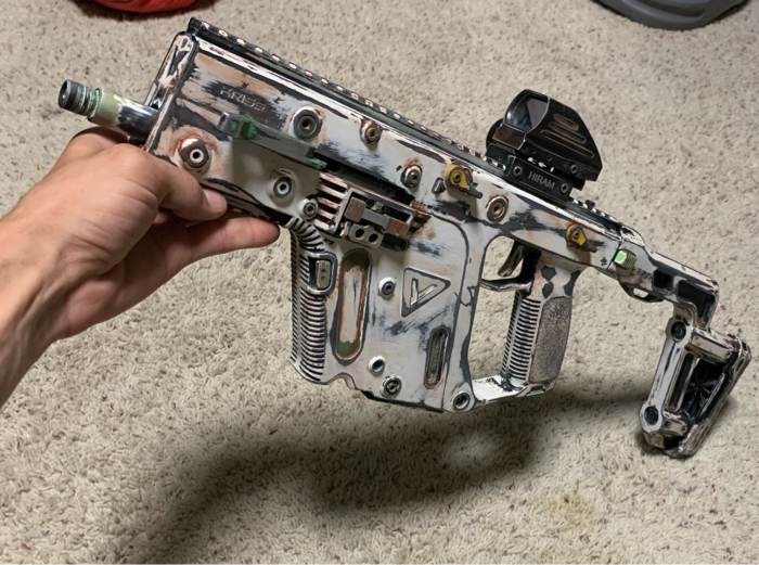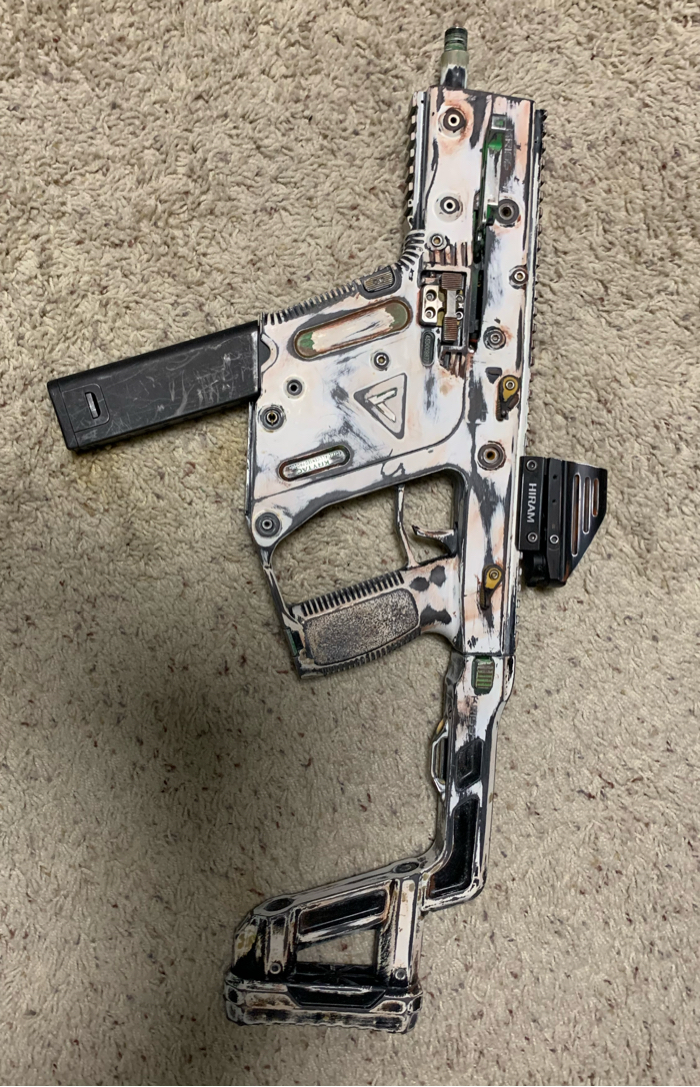 Drum mag, standard high cap magazine upgraded torque motor with speed gear ratio in vector shoots right around 500fps. Custom paint job.