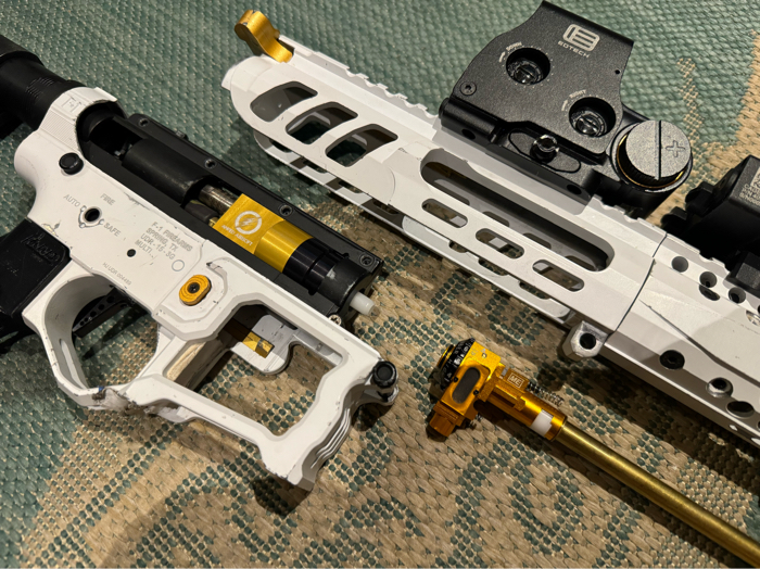 The rifle has a Polarstar Jack installed to power it. It’s the go to engine for many HPA users because it’s the most beginner friendly HPA engine if you were to instal, test, and tune it yourself but if you’re buying it from me, it’s all been done for you. Has a great rate of fire and is a great pick for beginners and experienced players alike. It’s paired with the best Hopup unit on the market, the maxx me pro, as well as a tight bore inner barrel