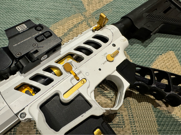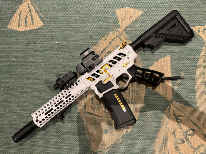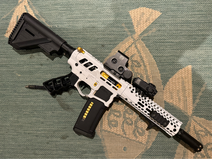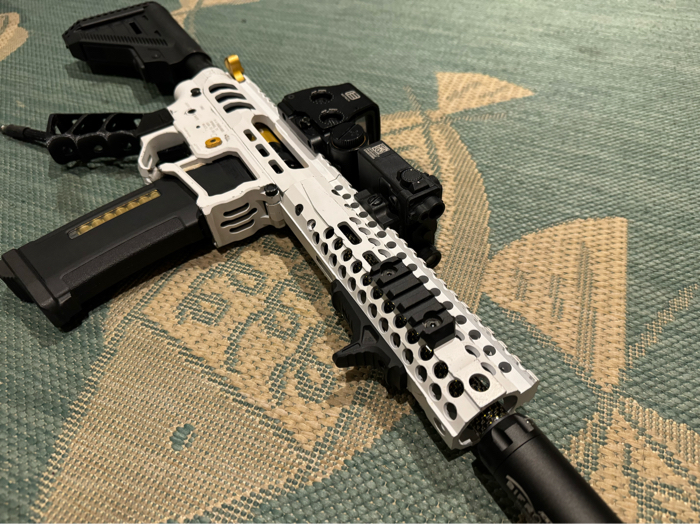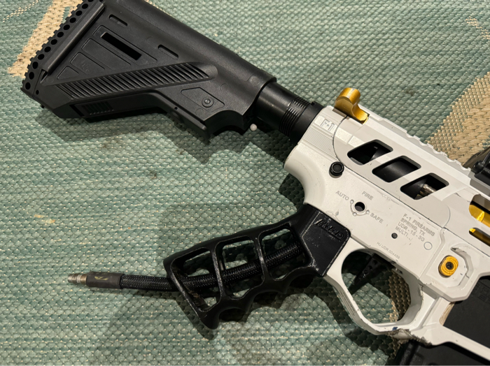 It’s a full metal body which is extremely light and comfortable to hold as well as a golden carbon fiber MAC outer barrel. The body is a skeletonized F1 firearms body with a MAD Skeletonized pistol grip. It has a finely tuned speed trigger to make shooting fast super easy. Shoots 350fps at 80psi with a .25g bb and up to 60rps. FPS range is 300-420. Comes a shown but without attachments or magazine. Tracer unit, battery charge, battery, fcu, airtank, regulator, and line can be added for extra.