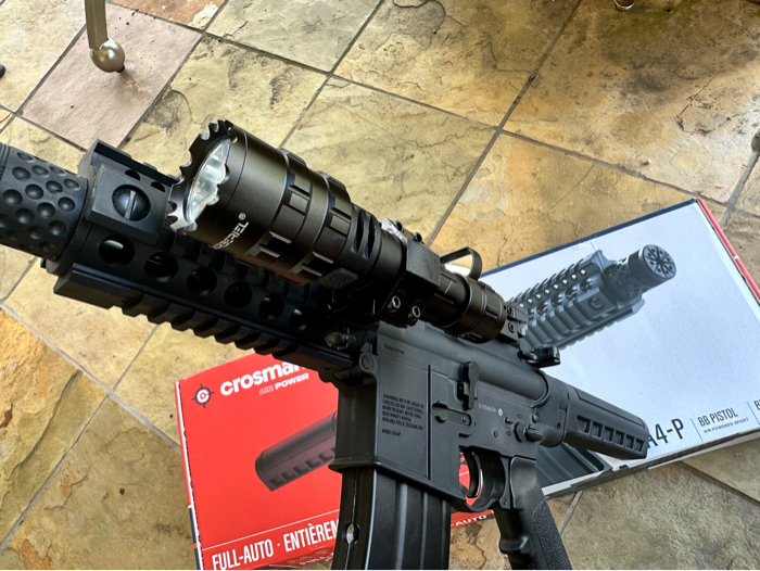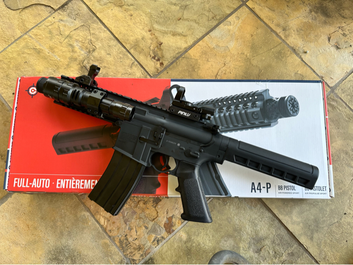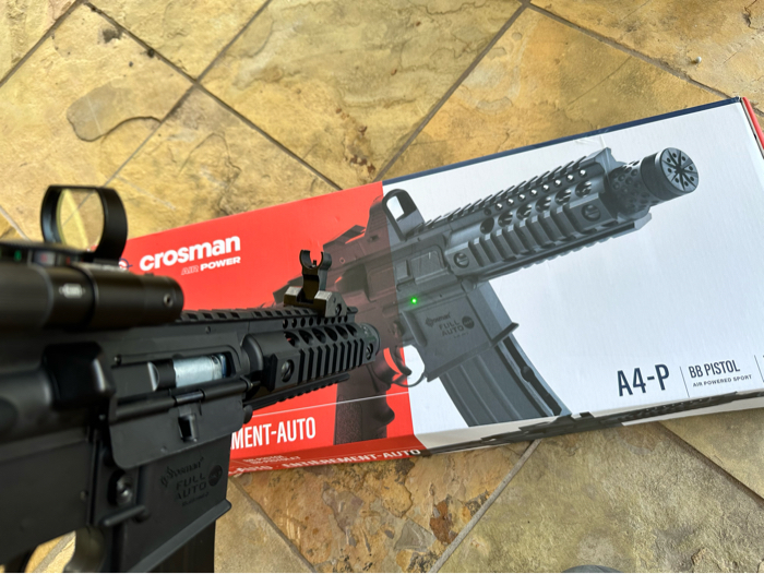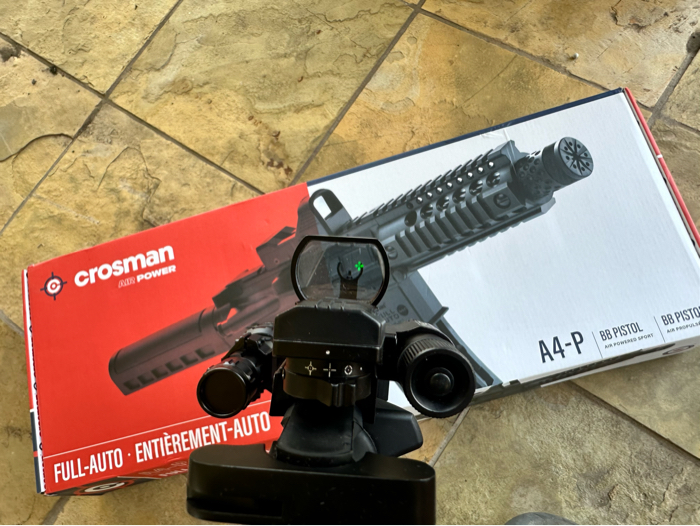 Crosman A4P with aftermarket reflex green/red dot, flash light, and laser. In great condition. Will come with 500 bbs. Inquire for more details
