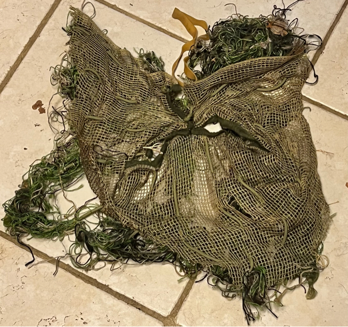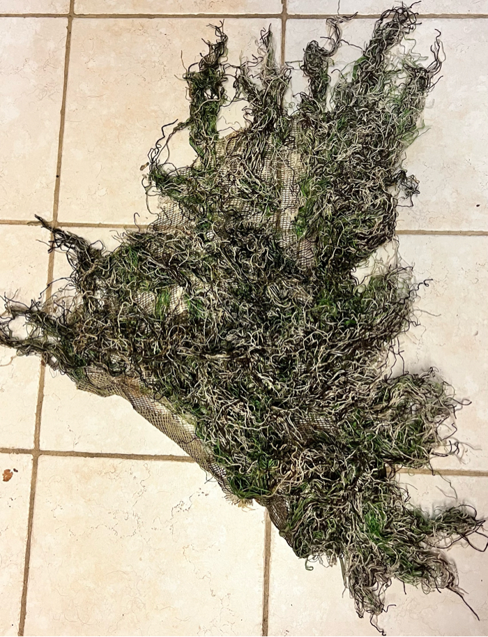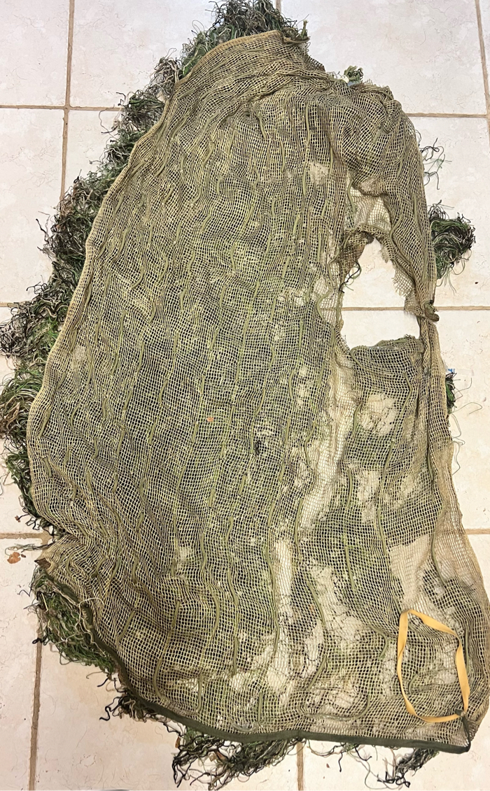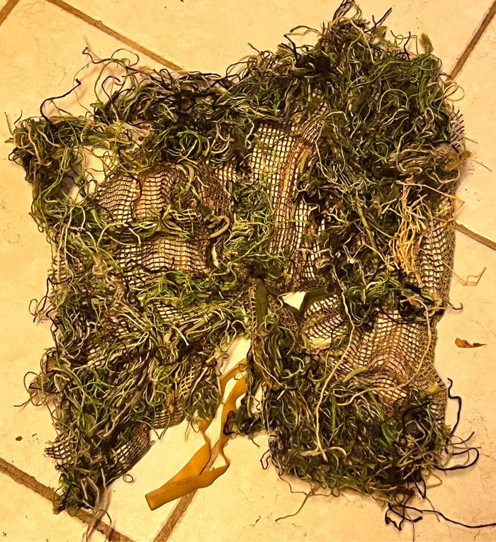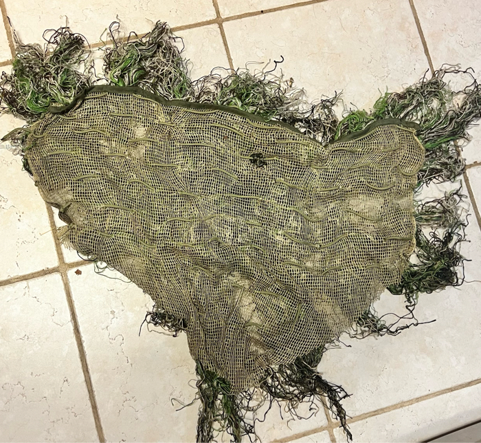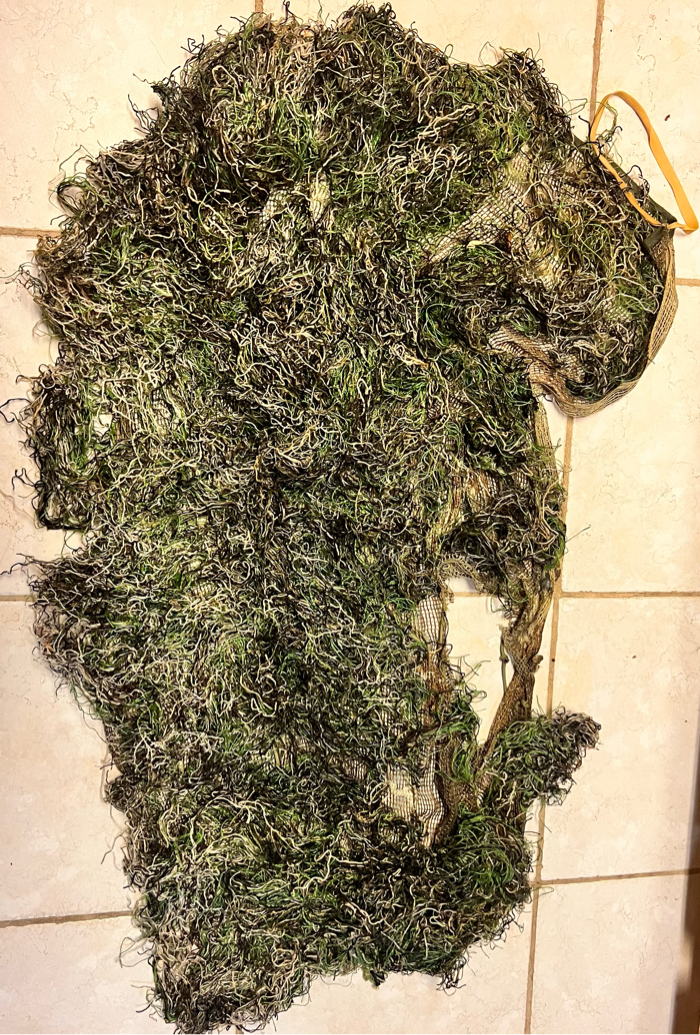 These are old ghillie projects. The first two pics are the makeshift cape, the biggest of the three. The second is a triangle shape as seen in the third and fourth pics, could be used as a rifle wrap or balaclava of sorts. The last two pics are… well idk wtf i was making tbh, but you could definitely find a use for it though. They have big rubber bands to help hold in place. Made these when i first started getting into ghillie crafting and airsoft in general so they’re far from perfect but i spent dozens of hours making these, its a very tedious process.