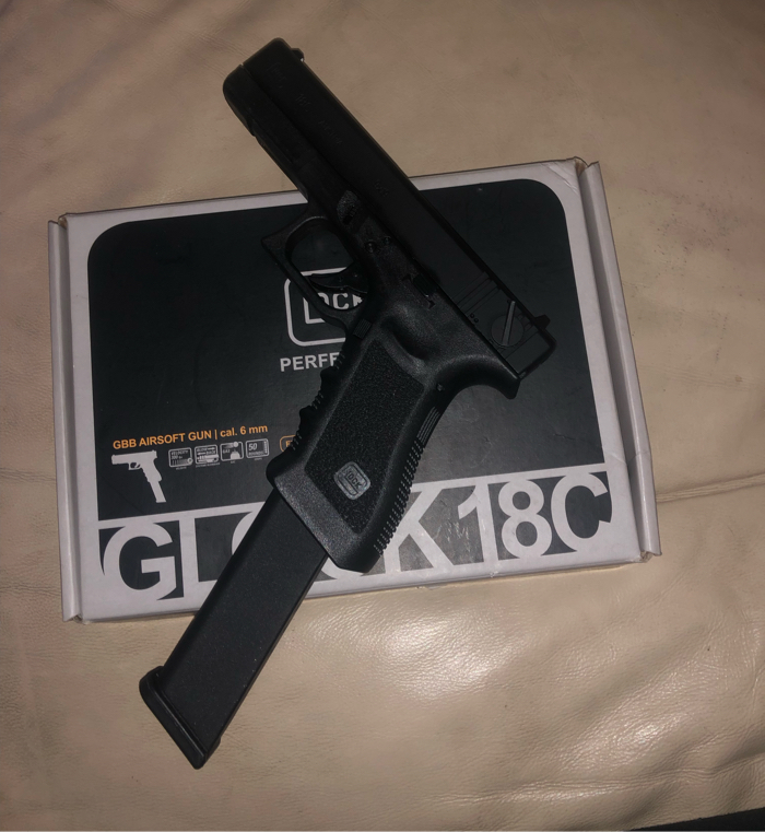 Here I have my Elite Force GLOCK 18c. Semi/Full auto switch. 50 round magazine capacity. Shoots flawlessly with no issues. Only shot a handful of times. Still oiled up. Will include green gas if needed. 190 OBO