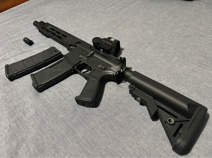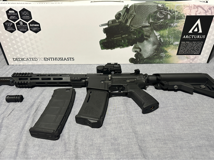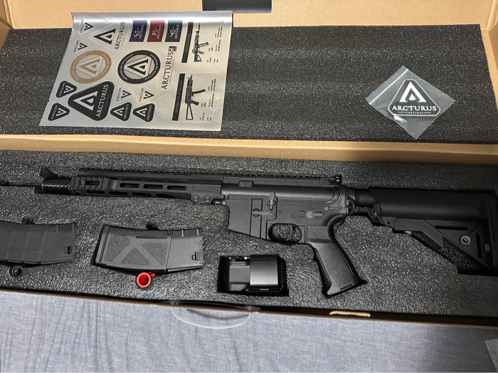 Arcturus lwt mk1 aeg airsoft rifle. The rifle is in really good condition used only a handful of times and shoots consistently at the 390-400fps range. Will come with an extra magazine, tracer unit, and red dot so you have a kitted out rifle ready for indoor cqb. Comes with original box and everything seen in photos. Great for beginners or for having a reliable backup gun. Has a tactile trigger feel as well that clicks when you pull it as well.