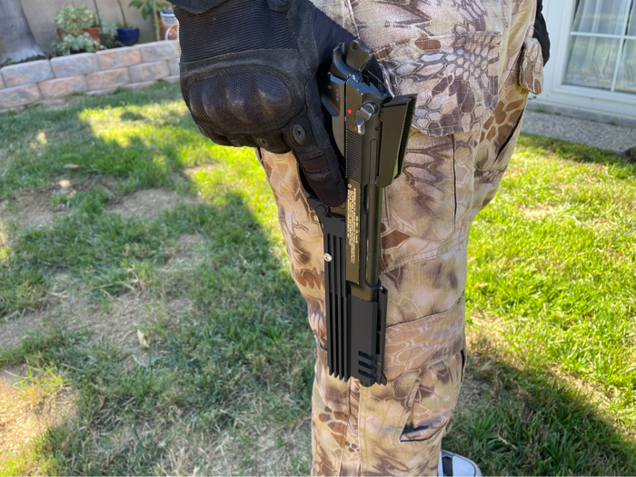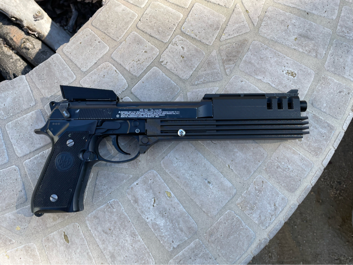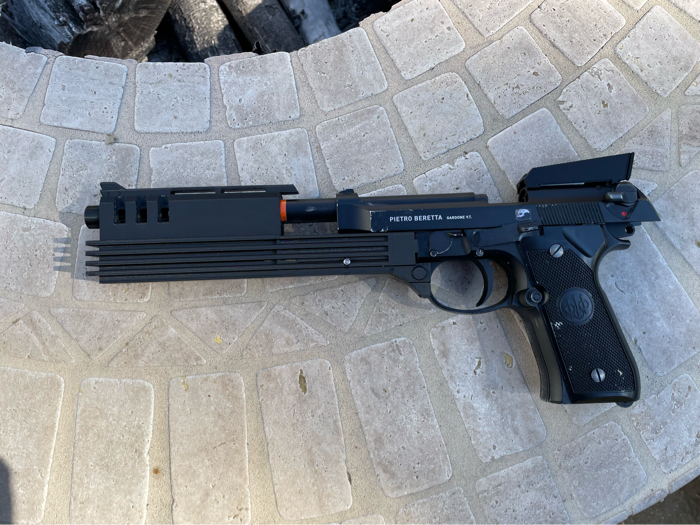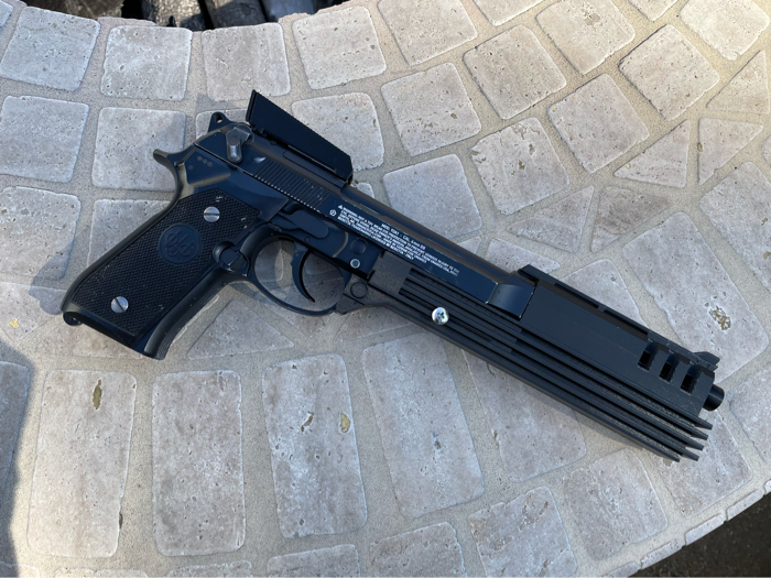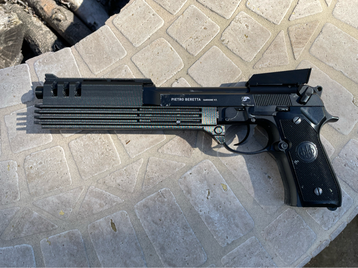 When it came to designing it, I wanted it to look good, but also be functional. The kit comes with iron sights that are similar to the ones in the movie. The front sight comes attached to the main shell price already and the *optional* rear sight can be attached via an adhesive strip and magnet that you remove before installation. The kit doesn’t get in the way of any normal M9 controls, so it can function as normal.