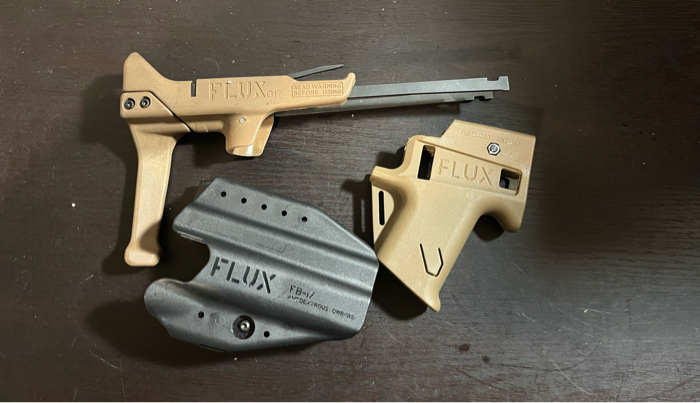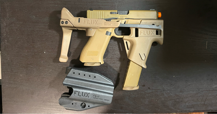 Replica Flux Defense Glock brqce. Fits the elite force glock 17 frame perfectly. Cant confirm any other brands. Comes with all hardware and holster. Pistol and magazines not included. Great condition, Never fielded, only assembled on and off. Holds mags tight, Mags don’t always drop free