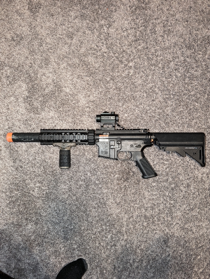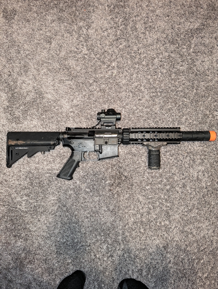 Gng aeg TAMYIA the barrel is scratched up. Modular for m4 parts polymer and plastic It's pretty light and shoots in between 300 and 320 Ask any questions